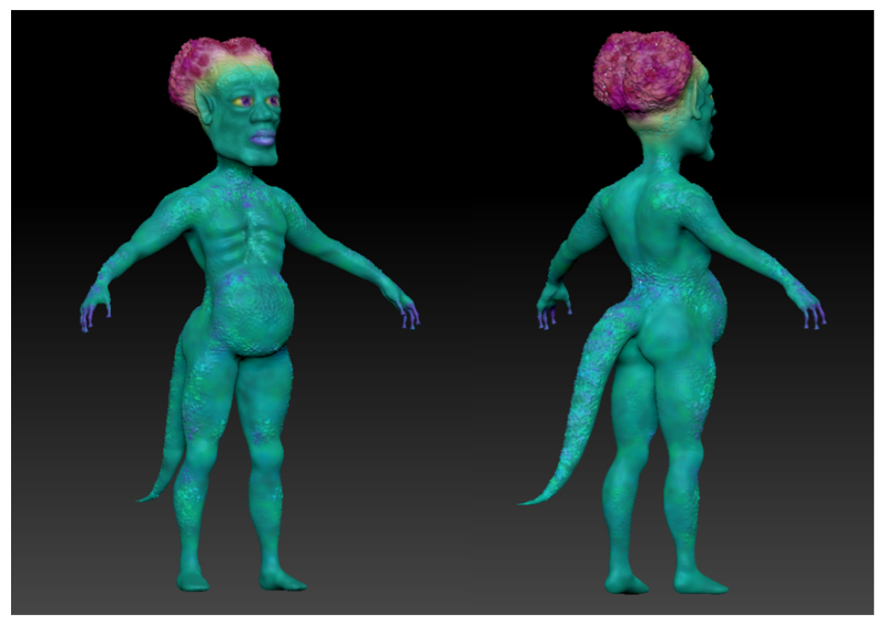 My aim was to take an innovative approach to designing Gumbo. Drawing inspiration from late 90s designs, I’ve managed to create a character that pays homage to the era while adding my own unique twist. The decision to maintain the short, overly thin, skeletal form with swollen bellies gives Gumbo a distinct silhouette that harkens back to classic alien designs. Incorporating the oversized head style with parts of the brain exposed adds an intriguing element to Gumbo's appearance, suggesting a high level of intelligence and perhaps even a hint of vulnerability. This blend of familiar tropes with fresh ideas breathes new life into the classic alien archetype, allowing Gumbo to stand out in his own right. My choice of colour scheme (ocean blue, purple, and bright pink) creates a striking visual contrast while also tying back to the swampy ecosystem of Gumbo's home planet. This incorporation of environmental elements adds depth to his character and enhances the overall sci-fi aesthetic. Lastly, drawing inspiration from the coarse texture of frogs and toads for Gumbo's webbed hands and suction-cup fingers adds a layer of realism and coherence to his design. This attention to detail not only reinforces his connection to his homeland but also adds a tactile element to his appearance, making him feel more tangible and immersive. Overall, I hope my approach to designing Gumbo is both inventive and respectful of classic design conventions. By blending familiar elements with fresh ideas and incorporating thematic coherence throughout, I feel I have created a character that feels both nostalgic and refreshingly original.
