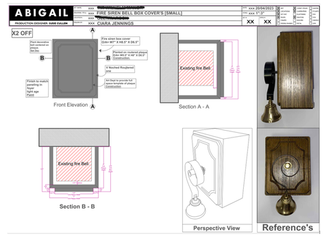 AutoCAD blueprints of bell boxes to cover-up fire sirens that are in one of the locations they are filming in but do not match the scene.